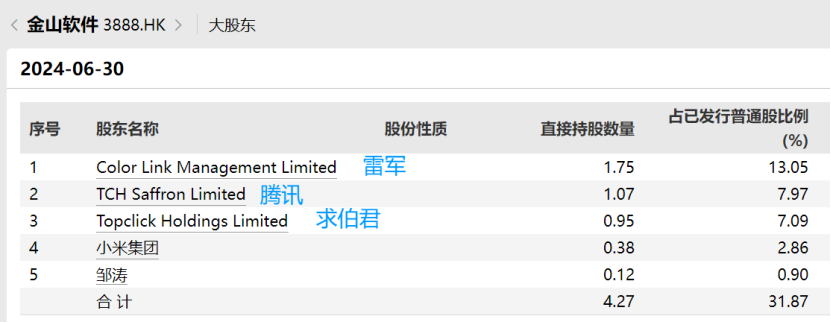 Taken together, Lei Jun’s personal shareholding in Kingsoft Office, which should be calculated as wealth, is only 1.14% (4.75%*15.62%+1%*5.63%+0.79%*42.86%), valued at about RMB 1.8 billion.